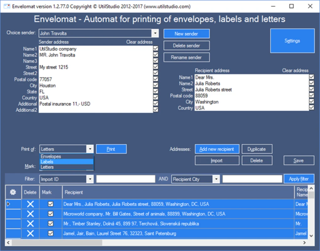 Software for envelope printing, including graphics editor of envelopes based on Firebird transactional database allowing safe local or remote connection. Contains library of standard envelopes in international and USA address writing formats. You may import addresses from: XML files (*.XML), CSV files (*.CSV), TXT files (*.TXT), DBase files (*.DBF), Firebird database (*.FDB), Microsoft SQL database (*.MDF), Microsoft Access database (*.MDA), Interbase (*.GDB), Paradox files (*.db). Integrated envelope designer allows you to create your own desing of envelopes including your own logo or background image. Automatic printer settings detection. This envelope printing software is designed for small business office or home.