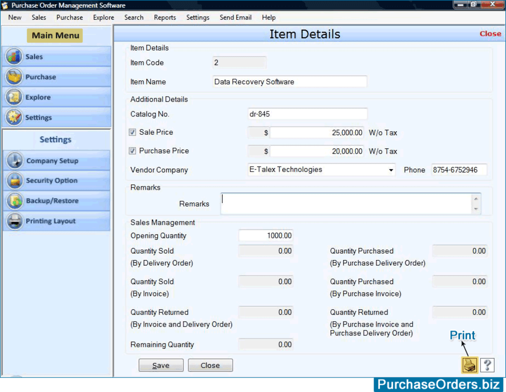 Purchase Order Software is useful for all companies and organization to track business sales and purchase details. Purchase order management program is fully capable to manage client/vendor information, sales/purchase order reports, company details and similar purchase order information. Software provides facility to backup and restore data with option to overwrite the existing records.